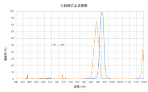 これらは同じ角度で入射しても、屈折率の見かけが異なるため、干渉における有効膜厚や透過スペクトルに異なるシフト量が生じます。一般的に、p偏光の方が角度依存性が強く、中心波長のシフトも大きくなります。そのため、設計段階で偏光状態を意識することが重要になります。